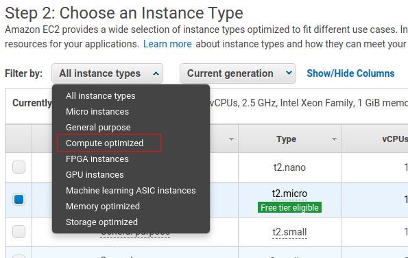 Next, choose your instance type. This defines the hardware specifications of the cloud instance. In this tutorial we set up a c5.2xlarge. This should be more than powerful enough since Avalanche is a lightweight consensus protocol. To create a c5.2xlarge instance, select the Compute-optimized option from the filter drop-down menu.